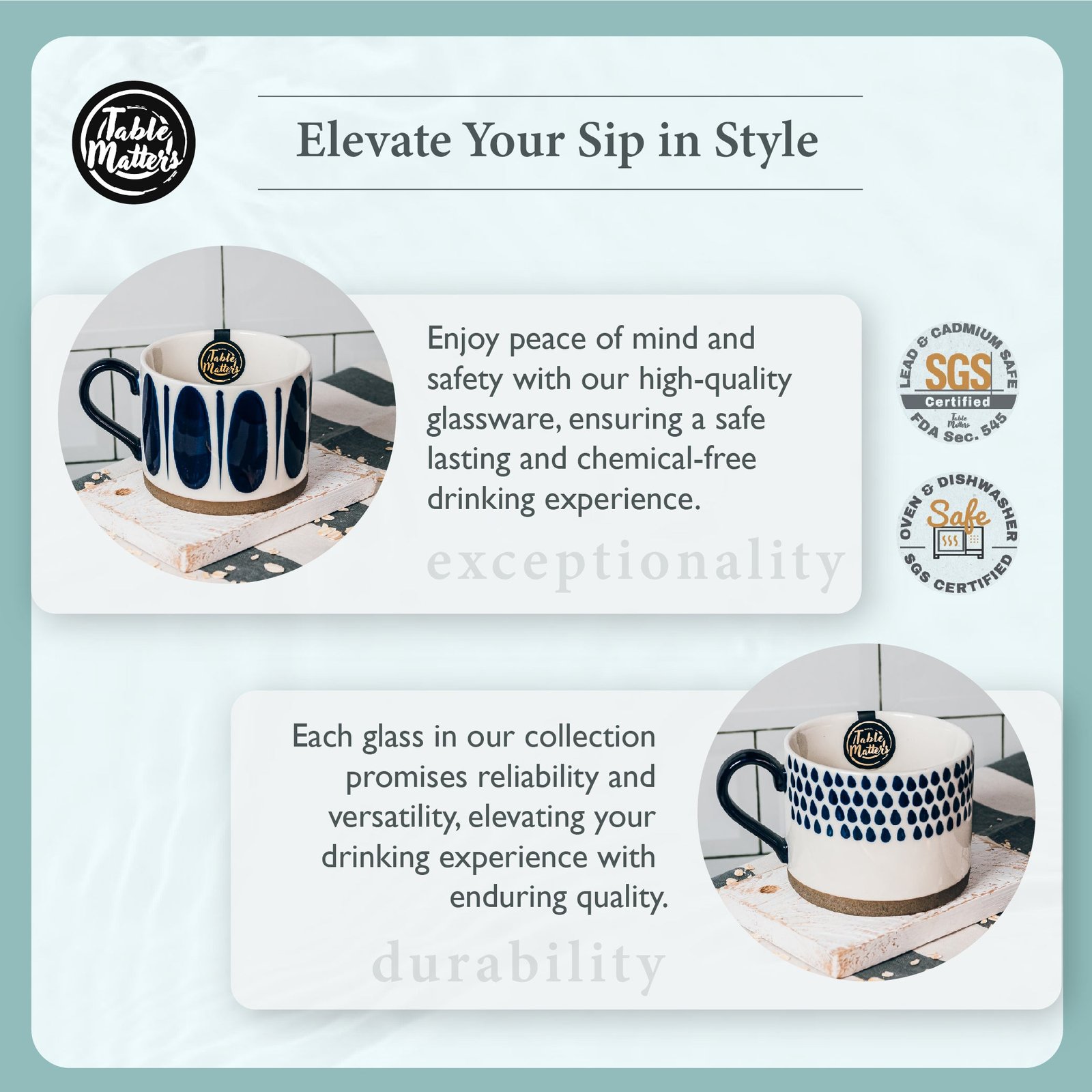 Our cups are Lead and Cadmium Free. Microwave Safe. Oven Safe and Dishwasher Safe.