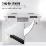 The snap-lock side handles guarantee the tightness and security of your treasured possessions. whilst its reinforced bottom promises impeccable stacking reliability. The crowning feature? The effortless wheels ensure that accessing your items is as smooth as the design.